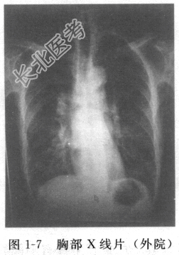 - [材料题] 患者男性,32岁,因“反复发热伴咳嗽、咳痰1周”入院。入院前外院急诊血常规提示WBC 13.6×109/L,N% 78%。胸部X线片(图1-7)示右下肺斑片状影。查体:双肺呼吸音粗,右下肺可闻及湿啰音。外院给予“头孢替安”等抗感染、退热等治疗后体温稍有下降,仍有反复咳嗽、咳痰。