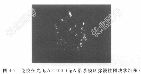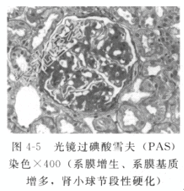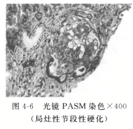 - [材料题] 患者男性,45岁,因“尿中泡沫增多3个月,双下肢水肿2个月”入院。患者无发热,无尿频、尿急、尿痛,无肉眼血尿,无少尿,无光过敏及口干、眼干,水肿反复出现,自服中草药1个月余(具体不详)。入院前检查“尿常规示尿蛋白(+++),尿潜血(++),红细胞230/μl;24h尿蛋白定量2.9g;双肾、输尿管、膀胱B超未见异常。”既往高血压病史二十余年,无肝炎、结核及药物过敏史。入院初步诊断:慢性肾炎综合征。3个月前发现尿中泡沫增多,2个月前发现双下肢水肿,无发热,无肉眼血尿,无关节痛,无光过敏、口腔溃疡,无皮疹等伴随症状。检查“尿蛋白(+++),尿潜血(++);24h尿蛋白定量2.9g”。既往高血压病史二十余年,平时血压控制可。拟诊“慢性肾炎综合征”收住院。入院后检查尿蛋白(+++),尿红细胞280/μl;24h尿蛋白2.1g;IgA 3.96g/L;血肌酐68μmol/L。排除禁忌后行“肾穿刺活检术”(图4-5~图4-7),病理诊断为“IgA肾病(局灶性节段性硬化性肾小球肾炎)HassⅡ型”。