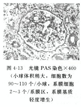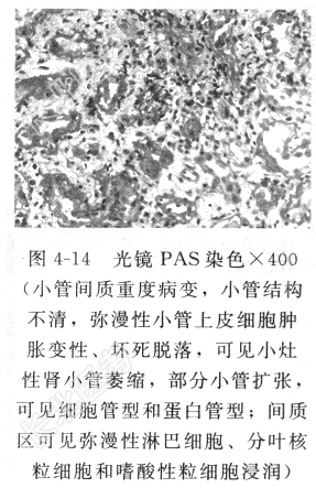 - [材料题] 患者女性,因乏力、食欲缺乏1个月余,血肌酐升高1周入院入院后肝肾功能示白蛋白39g/L,球蛋白40g/L,血糖4.9mmol/L,胆红素、转氨酶正常,肌酐316μmol/L。电解质示血钾3.4mmol/L,钙2.25mmol/L,磷1.04mmol/L。血常规示血红蛋白93g/L。尿常规示尿比重1.015,pH 6.50,尿蛋白(++),尿白细胞94/μl,白细胞酯酶(-)。乙型肝炎病毒表面抗体阳性,HIV、梅毒抗体、肿瘤标志物阴性,血M蛋白鉴定未见异常,自身免疫抗体检查全阴性,凝血功能正常,心电图、胸部正侧位片均未见明显异常。予经皮肾穿刺病理活检(图4-13、图4-14)示共12个肾小球,未见小球硬化,小球体积稍大,细胞数为90~110个/小球,系膜细胞2~3个/系膜区,系膜基质轻度增生。毛细血管袢开放,基底膜不厚,部分小球轻微球囊粘连。2个小球可见轻度囊周纤维化,Masson染色阴性。小管间质重度病变,小管结构不清,弥漫性肾小管上皮细胞肿胀变性、坏死脱落,可见小灶性肾小管萎缩,部分小管扩张,可见大量脱落坏死的细胞管型和蛋白管型;间质区可见弥漫性淋巴细胞、分叶核粒细胞和嗜酸性粒细胞浸润。小动脉壁轻微增厚,动脉壁未见透明样变性,血管腔内未见血栓形成,管壁未见明显炎细胞浸润。刚果红染色阴性。