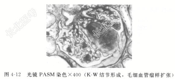 入院后行心脏彩超:左心房增大,二尖瓣、三尖瓣及主动脉瓣轻度反流,左心室舒张功能降低。颈动脉血管超声:双侧颈动脉多发斑块形成。肾活检病理学检查(图4-12):糖尿病肾病Ⅴ期。光镜:肾小球系膜区重度增宽,基质大量增生,呈结节样改变,系膜细胞数减少,外周毛细血管袢融合。免疫荧光:IgG沿肾小球毛细血管袢呈假线样沉积,伴有IgM、C3线样沉积。电镜:肾小球基底膜弥漫性增厚,正常结构消失。系膜基质增多,形成K-W结节。