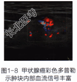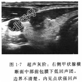 - [材料题] 患者男性,48岁,因“发现右颈部肿块半年”入院。患者自诉于半年前在一次单位的例行体检中发现右颈部一肿块(具体不详),无伴随任何不适,当时未予重视就诊。1个月前自觉肿块增大,遂就诊于我院。发病以来,一般情况尚可,进食和大小便如常,体重无变化。体格检查体温(T)36.1℃,呼吸(R)21次/分,脉搏(P)82次/分,血压(BP)137/88mmHg。神志清楚,表情自然,面色如常,气管无偏移,右颈部甲状腺中极可扪及一直径约蚕豆大小肿块,质地硬,边界不清楚,触痛明显,随吞咽上下移动,未能扪及明显肿大淋巴结。辅助检查血常规、尿常规、粪常规、甲状腺功能(T₃、T₄、FT₃、FT₄、TSH、TG、TG-Ab、TPO-Ab)以及肝肾功能、电解质和血清癌胚抗原(CEA)等肿瘤标志物在内的实验室检验结果未见明显异常。双侧甲状腺超声:右侧甲状腺中部可见一实性肿块,直径约0.8cm,形态不规则,边缘呈毛刺状,内见细小密集的钙化点,颈部可见多个肿大淋巴结,形态不规则,边界不清楚(图1-7,图1-8)。