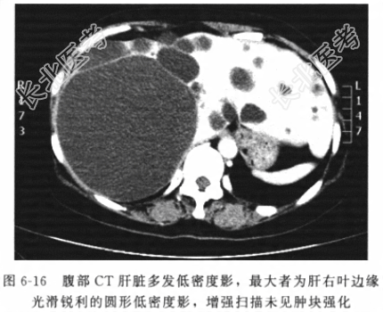 - [材料题] 患者男性,48岁,因“上腹部饱胀不适伴纳差1年”入院。患者1年前出现上腹部饱胀不适锌纳差,进食后加重,无反酸、嗳气、畏寒、发热及恶心、呕吐等其他伴随不适。近一个月来,症状加重,进食多后更为明显。发病来,一般情况可,无明显体重减轻。否认有“胃炎”、“胆囊炎”、“肝病史”。体格检查体温(T)36.6℃,呼吸(R)20次/分,脉搏(P)81次/分,血压(BP)121/70mmHg。神志清楚,皮肤干燥,巩膜无黄染。腹平软,未见胃肠型或蠕动波,Murphy征(-),全腹未能扪及包块,肝肋下未及,移动浊音(-),肠鸣音无亢进或减弱。蛊肠指检未及异常占位,退出时指套无染血。辅助检查三大常规、肝肾功能、病毒、电解质、凝血功能、血气分析结果均未见明显异常。腹部B超提示肝脏多发无回声液性暗区,最大位于肝右叶大小约10cm×10cm×8cm边界清晰的无回声液性暗区。腹部CT平扫(图6-16)示肝脏多发低密度影,最大者肝右叶边缘光滑锐利的圆形低密度影,增强扫描未见肿块强化。