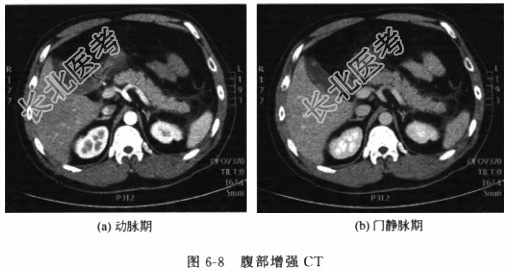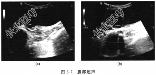 - [材料题] 患者女性,79岁,因“反复右上腹不适1个月余”入院。患者于1个月前始反复出现右上腹闷胀不适,偶伴右肩部酸胀,恶心、纳差,当时未予重视,自行口服“胆舒胶囊”,症状略有好转,但不久又出现上述不适,遂就诊于我院普外科门诊,查超声提示为“胆囊占位”,为进一步诊治住入我科。病程中无发热、黄疸、胸闷、咳嗽、腹痛、腹胀、血尿和尿频等不适。发病以来,一般情况尚可,大小便无异常。否认有手术史。体格检查体温(T)36.8℃,呼吸(R)20次/分,脉搏(P)68次/分,血压(BP)105/70mmHg。神志清楚,皮肤黏膜光滑,巩膜无黄染。腹部平坦,未见胃肠型或蠕动波,无压痛、反跳痛和肌紧张,全腹未扪及包块,叩诊呈鼓音,肠鸣音2~5次/分。直肠指检未及异常占位,退出时指套无染血。辅助检查血常规示白细胞8.9×10⁹/L,中性粒细胞88%,其他实验室检验结果包括肝肾功能、电解质、血气分析和肿瘤标志物结果未见明显异常。腹部肝胆胰脾肾超声(图6-7)提示胆囊占位,深度达肌层,尚未突破浆膜层。腹部CT(图6-8)提示胆囊底部新生物向胆囊腔内突起,直径约1cm,增强有强。