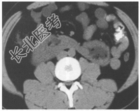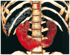 - [材料题] 患者男性,31岁,主因"发现左肾积水3个月"就诊。无腰痛,无发热,无尿频、尿急,无呕心呕吐。门诊行B超检查:提示左肾轻度积水,双肾下极融合。入院后行腹部CT平扫及三维重建(见图)。