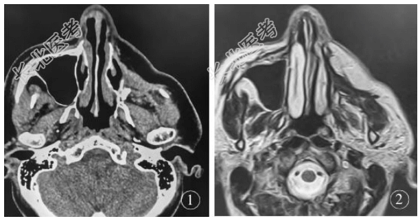 专科检查:双侧面颊部不对称,左侧颌面部软组织明显凹陷约2.0cm×3.0cm×5.0cm。皮肤软组织与颌面骨骨质明显粘连,皮肤软组织活动性较差,左侧颌面部肌肉活动时,其表面皮肤可见明显牵拉,张口功能未见明显受限。头部CT平扫(图1)显示:左侧上颌窦骨壁及部分颧骨缺如,未显示正常上颌窦结构,双侧颌面部不对称,左侧颌面部凹陷。头部MRI(图2)显示:双侧颌面部不对称,左侧颌面部凹陷,左侧颌面部皮下脂肪层覆盖于左侧颞肌前外侧,左侧无正常上颌窦结构。入院诊断:左侧面部凹陷畸形。