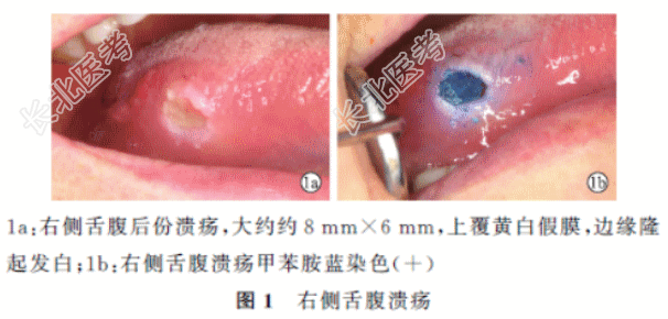 专科检查:右舌腹后份可见一处大小约8mm×6mm的椭圆形溃疡,上覆黄白色假膜,周缘发白,稍隆起,质韧,触痛明显(图1a);48残根;47舌侧边缘嵴锐利,与溃疡面对应。舌活动正常,静止时不自主颤动。辅助检查:右舌腹溃疡甲苯胺蓝染色(+)(图1b)。初步诊断为右舌腹溃疡待查。