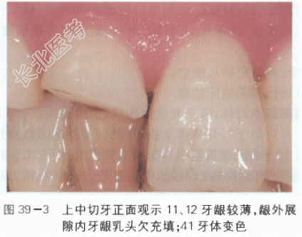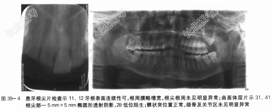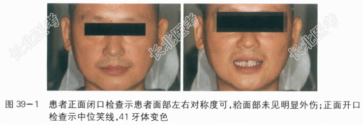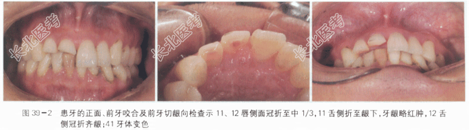 [材料题] 病历资料1.主诉:上前牙折断伴疼痛3天。2.现病史:患者,男性,34岁,3天前参加公司足球运动时面部被同事头部撞击,上前牙折断脱落,遂至我院口腔外科就诊,经口腔外科门诊初步检查,在排除面部骨折可能性后建议转诊至口腔修复科进一步明确患牙的治疗方案。3.既往史:患者定期行口腔检查,年均2次口腔洁治。否认有心脏病、糖尿病、高血压等系统性疾病病史,否认药物过敏史。4.临床检查:患者神清气平,对答切题。面部左右对称(见图39-1),开口型“S”,开口度3指,耳前区及外耳道扪诊无疼痛,无弹响;11、12牙冠唇侧横折至中1/3,11舌侧折至龈下3.5mm,髓腔暴露,探诊疼痛,叩诊疼痛,舌侧龈缘略红肿,无松动;12舌侧折至齐龈,髓腔暴露,探诊疼痛,叩诊疼痛,无松动;41牙体变色,切端磨损,叩诊疼痛,无松动(见图39-2),电活力无反应;31电活力正常。18、38无对合,牙齿伸长;11、21颈部区域较窄,龈外展隙内龈乳头欠充填(见图39-3);中位笑线,余牙牙龈较薄,颈缘线呈扇贝状;Ⅰ度深覆覆盖正常,后牙咬合关系可。上下个别前牙牙颈部见色素沉着,局部口腔卫生不佳。5.影像学检查:根尖片示11、12牙根形态连续,根周膜略增宽,未行牙髓治疗,根尖周组织未见明显异常;31、41根尖部见一5mm×5mm椭圆形透射阴影;余牙根尖周组织未见明显异常;全口牙位曲面体层片示28低位阻生,颞下颌关节开闭口薛氏位影像未见关节区异常(见图39-4)。 诊治经过:1.明确患者整体情况:明确患者整体情况,按轻重缓急的原则安排病史询问、临床检查等程序。(1)面色、神态、体态、步态:患者自主走入诊室。(2)神智、沟通能力:神清,对答切题。2.围绕主诉有的放矢地询问病史(1)询问患牙的部位:上前牙折断疼痛,余牙未诉异常。(2)询问患牙受伤的时间和原因:3d前运动时上前牙受外力撞击。(3)询问患牙的状况:牙齿因疼痛进食困难。(4)询问患牙是否经过急症处理,采取了哪些检查措施:当日患者自行回家,未进行急症处理,3d后至我院口腔外科门诊就诊,并行全口牙位曲面体层片及颞下颌关节开闭口薛氏位片检查,在排除开放性软组织损伤及面部骨折后转诊至口腔修复科进一步明确诊断。(5)询问余牙诊治及口腔卫生护理情况:定期全口洁治。(6)询问全身状况,有无高血压、脑梗死、心脏病、肝病、糖尿病等疾病史:否认有心脏病、糖尿病、高血压等系统性疾病病史。(7)询问有无药物过敏史:否认药物过敏史。3.在了解病史的情况下进行相关临床检查(1)面部检查:左右面部基本对称,未及开放性伤口,中位笑线。(2)颞下颌关节区检查:开口型“S”,开口度3指,耳前区及外耳道扪诊无疼痛,无弹响。(3)牙列及牙体检查:11、12牙冠唇侧折至中1/3,11舌侧折至龈下3.5mm,12舌侧折断齐龈,11、12露髓,叩诊疼痛,无松动;41牙体变色,叩诊疼痛,无松动,电活力无反应;31电活力正常;18、38伸长,无对合。(4)咬合关系检查:前牙Ⅰ度深覆,覆盖正常!后牙咬合关系可。(5)牙周检查:11舌侧龈缘略红肿,余牙牙龈较薄,颈缘线呈扇贝状;11、21龈外展隙间龈乳头欠充填;局部口腔卫生较差,牙颈色素沉着。(6)影像学检查:根尖片示11、12牙根形态连续,根周膜略增宽,未行牙髓治疗,根尖周组织未见明显异常;31、41根尖部见5mm×5mm椭圆形透射阴影;余牙根尖周组织未见明显异常;全口牙位曲面体层片示28低位阻生,颞下颌关节开闭口薛氏位影像未见关节区异常。