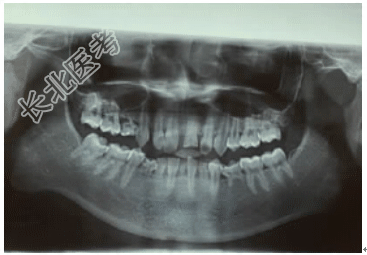 [材料题] 一般资料病例男,16岁主诉因“乳牙未替换、进食时下前牙咬上颌牙龈”就诊。现病史其母亲叙述,患者出生后乳牙萌出正常,但换牙较同龄人晚,有部分牙齿至今未替换,近日出现进食时咬上颌牙龈导致疼痛现象。患者8岁时,因跌倒致左上前牙横折,曾在外院行“根尖诱导成形术”。既往史既往体健,母乳喂养,无拔牙史及药物过敏史,否认传染病史及家族遗传病史,否认孕期接触X线照射,无重大疾病及毒物接触史。家族史独子,家族中无类似患者,父母体健,牙齿均未见异常。体格检查身高172cm,体重56kg,神志清楚,对答切题,心、肺、脊柱及四肢未见异常,毛发、汗腺等发育正常,指、趾甲正常。口腔专科检查:混合牙列,11、12、13、16、17、21、22、23、25、26、27、31、34、36、37、42、45、46、47萌出,55、73、75、81、83、84滞留。右侧磨牙中性关系,左侧磨牙远中关系,21牙冠1/2横折,色暗,叩(-),不松动;全口乳牙均有不同程度松动,上颌牙列散在间隙,下前牙舌倾,前牙深覆合Ⅲ°,深覆盖Ⅰ°;面型左右对称,侧面观呈直面型,下颌后缩,张口度及颞颌关节未见异常。辅助检查全口曲面断层片(图1)示:14、15、24、32、33、35、41、43、44未见牙胚;乳牙根部分吸收;21根尖周低密度影。