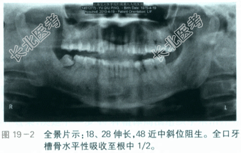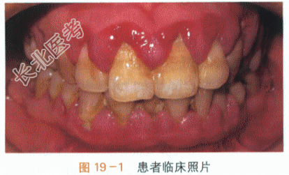 - [材料题] 患者,女性,40岁,近1年来全口牙龈增生,否认有自发痛史。平日有刷牙出血症状,随着牙龈的增生,刷牙出血越来越严重。否认夜磨牙、紧咬牙及口呼吸等不良习惯。既往史:有高血压病史3年余,服用硝苯地平控制良好。否认肝炎、心脏病、糖尿病等疾病;否认其他系统性疾病。否认药物过敏史。否认吸烟及酗酒史。否认有家族遗传史。查体:(1)口外检查:患者面部对称,无畸形,开口度、开口型均正常,未触及肿大的淋巴结。(2)口内检查:牙列完整,18、28伸长,48近中斜位阻生。口腔卫生不佳,牙石Ⅲ°,软垢Ⅲ°,菌斑Ⅲ°。全口牙龈增生明显,覆盖1/3牙面,同时伴有充血水肿,牙龈质地较韧。牙龈增生区域未及明显压痛。全口BOP(+),全口PD普遍5~6mm,AL普遍3~4mm,探及大量龈下牙石,全口牙齿无松动。前牙深覆