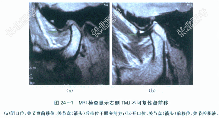 面部无红肿。张口度2.5cm,张口型右偏。双侧颞下颌关节区张闭口未及弹响,右侧髁突动度较左侧小。右侧耳屏前压痛(+),左耳屏前、双侧乙状切迹及双侧咬肌区均未及压痛。口内牙列完整,咬合关系正常,牙齿无松动、无叩痛。口腔卫生良好,口内牙龈及其他黏膜色泽正常,无破溃、肿胀及压痛。5.影像学检查MRI:张闭口过程中关节盘均位于髁突前上方,右侧颞下颌关节关节盘不可复性前移位(见图24-1)。患者口腔卫生良好,咬合关系正常,牙列完整,牙齿无松动及叩痛。口内牙龈及黏膜无红肿及压痛。(3)张口度及张口型的检查:张口度是指受检者大开口时,上、下颌中切牙近中切角之间的垂直距离。正常开口度平均为3.7cm,小于3.7cm为张口受限。开口型是指下颌自闭口到张大的整个过程中下颌运动的轨迹。正常成人开口型不偏斜,呈垂直向下,而颞下颌关节紊乱患者常出现开口型异常(偏斜或扭曲)。患者张口度2.5cm,属于张口中度受限,张口型右偏。(4)颞下颌关节的检查,通过患者的开闭口运动、前伸运动和侧方运动,检查关节功能是否正常,有无疼痛、弹响和杂音;两侧关节动度是否一致,有无偏斜;开口度和开口型是否正常,以及在开闭口运动时是否出现关节绞锁等异常现象。患者张口度变小,张口型右偏,双颞下颌关节未及弹响,右侧耳屏前有压痛。(5)咀嚼肌检查,检查颞肌、咬肌等咀嚼肌群的收缩力,触压其是否有疼痛,观察两侧是否对称、协调。在口内可按咀嚼肌的解剖部位进行左右对比,检查有无压痛等异常。患者各咀嚼肌区无压痛。