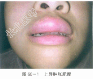 4.临床检查:患者神清气平,对答切题。BP140mmHg/80mmHg,P70次/min。全身皮肤未见明显异常。上唇皮肤肿胀明显,颜色正常,表面光亮,边界不清(见图60-1),压之无明显疼痛,质韧有弹性,无皮温升高。口内上唇黏膜肿胀,边界不清,无压痛。舌体未见明显肿胀,伸舌自如,无明显偏斜。其余黏膜组织未见明显异常。11、21近中邻面树脂充填,无叩痛,无松动,牙龈无红肿。