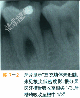 面见银汞充填物,均完整,边缘无继发龋,无叩痛,无松动。 辅助检查: (1)牙髓电活力测试:与对照牙相比较,16牙髓活力读数略有下降,36牙髓活力读数明显下降。 (2)影像学检查,如图7-1、图7-2所示。