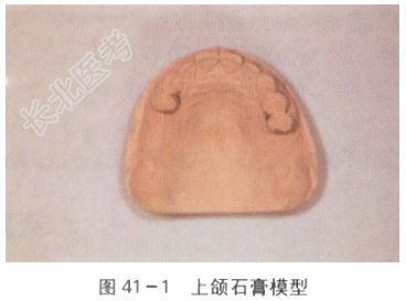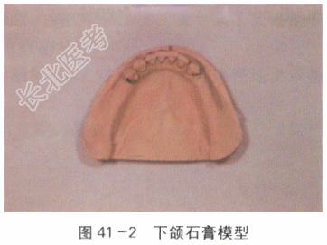 面部对称,无畸形,张口度及张口型正常。15、16、17、26、27、35、36、37、44、45、46、47缺失。拔牙创愈合良好。缺牙区牙槽嵴无明显骨突、骨嵴,无明显吸收。14、24、25、34颈部的楔状缺损已行充填治疗。余留牙无松动,牙龈无红肿充血。咬合状况无异常,缺牙区合龈距离基本正常。具体如图41-1、图41-2所示。
