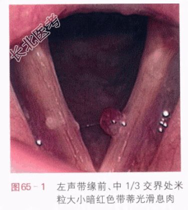 辅助检查:硬管喉镜:左声带游离缘前、中1/3交界处米粒大小新生物,暗红色,带蒂,表面光滑。右侧相应声带缘黏膜稍突起(见图65-1)。