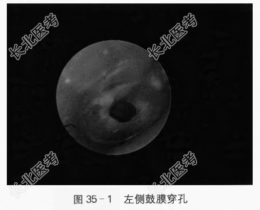 辅助检查:(1)纯音测听提示左耳传导性聋,平均言语频率气导35dB,气骨导差约10~15dB。(2)声阻抗提示左侧鼓膜穿孔。(3)耳内窥镜显示左侧鼓膜紧张部大穿孔(见图35-1)。