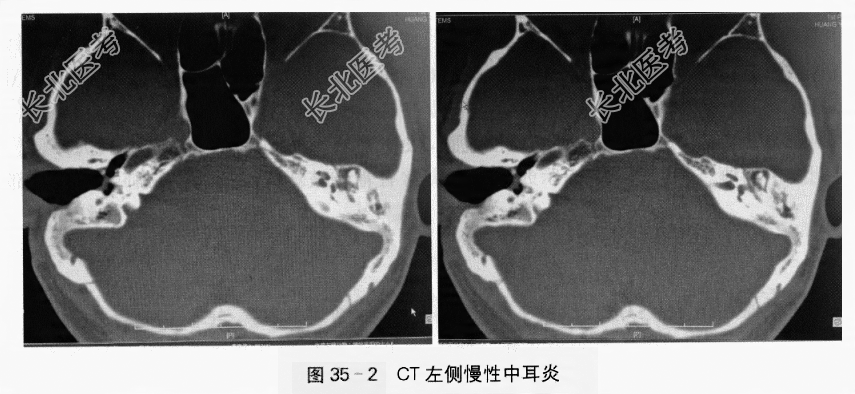(4)双侧中内耳放大CT提示:左侧乳突气房阻塞性炎症表现、鼓窦和鼓室内低密度影(见图35-2)。