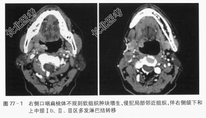辅助检查:(1)活检病理结果示:(右扁桃体)鳞状上皮细胞癌。(2)口咽及颈部增强CT检查示:右侧口咽扁桃体弥漫性不规则软组织肿块增生,约2.2cm×2.0cm×3.5cm,增强扫描不均匀强化,边界欠清晰,向前达右侧腭舌沟,下达右侧舌根,向内侵犯右侧软腭,外端咽旁间隙,双侧颌下区淋巴结肿大,右侧为著伴液化,约2cm×1cm,右上中颈部Ⅱ、Ⅲ区多个肿大淋巴结,约1.2~1.8cm,伴液化坏死。右侧口咽扁桃体不规则软组织肿块增生,侵犯右腭舌沟、舌根、软腭和咽旁间隙,右颌下和上中颈Ⅰb、Ⅱ、Ⅲ区多发淋巴结转移,左侧颌下可疑淋巴结转移(见图77-1)。