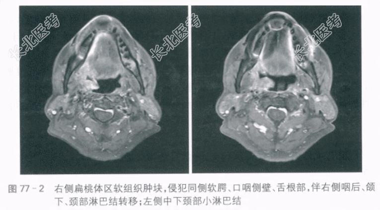 (3)口咽及颈部增强MRI:右侧扁桃体区软组织肿块,侵犯同侧软腭、口咽侧壁、舌根部,伴右侧咽后、颌下、颈部淋巴结转移;左侧中下颈部小淋巴结(见图77-2)。