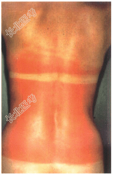 - [材料题] 患者,女性,30岁。因“面部、背部发疹1天伴灼痛”就诊。患者2天前在海边沙滩度假,有暴晒史,1天前晨起即发现面部和后背部暴露部位红肿、灼热疼痛,当时自行予凉水湿敷半小时后稍缓解,但红肿仍进行性加重,夜间灼痛难忍,遂就诊本院。追问病史,患者发疹前1天海边度假时,在10:00~14:00阳光最猛烈的时候有近2h在海水中游泳,而且未采取任何的防护措施。既往史:否认传染病史,否认手术外伤史,否认输血史,否认过敏史,否认高血压和糖尿病等其余系统疾病。体格检查:T 37.0℃,P 80次/min,R 20次/min,BP 120 mmHg/69 mmHg。神志清楚,精神可,营养好,回答切题,自动体位,查体合作,全身浅表淋巴结无肿大。头颅无畸形,巩膜无黄染。双侧瞳孔等大等圆,对光反射灵敏。颈软,无抵抗,甲状腺无肿大。胸廓对称无畸形,胸骨无压痛;双肺呼吸音清晰,未闻及干、湿性啰音。腹平坦,腹壁软,全腹无压痛,无肌紧张及反跳痛,肝脾肋下未触及,肝肾脏无叩击痛。脊柱、四肢无畸形。肌力正常,肌张力正常,生理反射正常,病理反射未引出。皮肤科体检:额部,双侧颧颊部、后背部弥漫性水肿性红斑。如图所示。