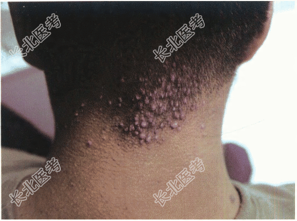 - [材料题] 患者,男性,23岁,因“头皮弥漫性反复皮疹伴疼痛2个月”就诊。曾在外院拟“毛囊炎”,口服罗红霉素,外涂百多邦治疗,有效但易反复,且有加重,轻度疼痛。既往史:否认传染病史、否认手术外伤史、否认输血史、否认过敏史,否认高血压和糖尿病等其余系统疾病。查体:T 37.0℃,P 80次/min,R 20次/min,BP 120 mmHg/69 mmHg。神志清楚,精神可,营养好,回答切题,自动体位,查体合作,全身浅表淋巴结无肿大。头颅无畸形,巩膜无黄染,双侧瞳孔等大等圆,对光反射灵敏。颈软,无抵抗,甲状腺无肿大。胸廓对称无畸形,胸骨无压痛;双肺呼吸音清晰,未闻及干、湿啰音。腹平坦,腹壁软,全腹无压痛,无肌紧张及反跳痛,肝脾肋下未触及,肝肾脏无叩击痛。脊柱、四肢无畸形。肌力正常,肌张力正常,生理反射正常,病理反射未引出。皮肤科体检:头皮见散在的、不融合的毛囊性丘疹,周围有炎性红晕,少数有脓头,中间有毛发穿过,部分结痂(见下图)。