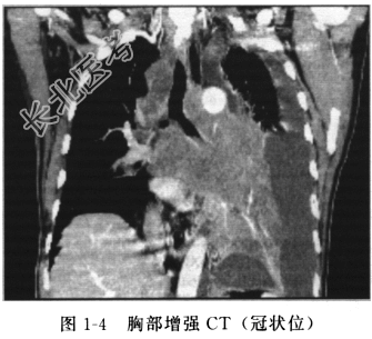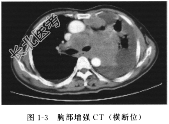 患者老年男性,因咳嗽、痰中带血、发热入院,既往吸烟多年。入院后增强CT(图1-3、图1-4)示:左肺门见不规则软组织影(大于7cm),多个纵隔淋巴结肿大,左侧胸腔积液。头颅MRI、腹部超声及全身骨ECT未见明显异常。肿瘤标志物NSE升高。胸腔积液细胞学检查,连续3次找到小细胞癌细胞。