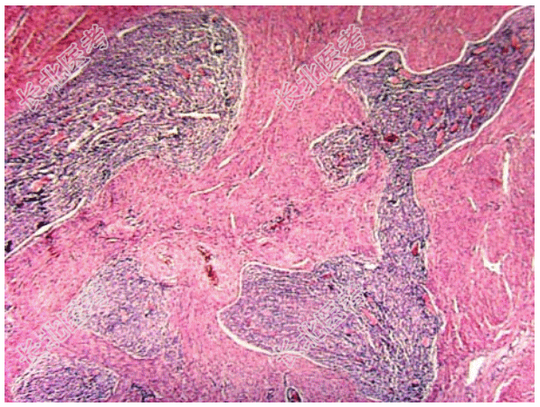 - [材料题] 患者女性,46岁,B超检查发现子宫异常增大,行子宫切除。大体见子宫一肿物呈圆形,表面粗糙,切面可见坏死(如图)。显微镜下见肿瘤细胞大小较一致,核分裂多见,10个/10HP,部分区见浸润性生长(如图)。免疫组化DES(-)、CD10(+)。