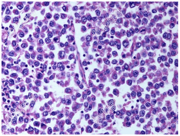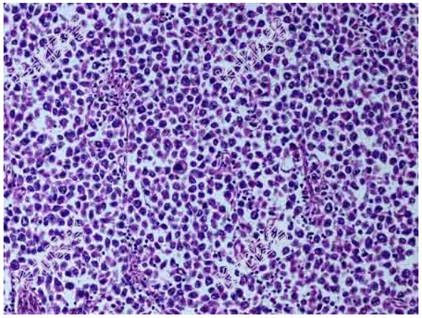 - [材料题] 患者男,56岁,发现睾丸肿大半年。行睾丸切除,大体见肿瘤几乎占整个睾丸,切面灰黄,鱼肉状。镜检如图所示。