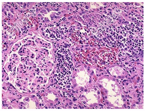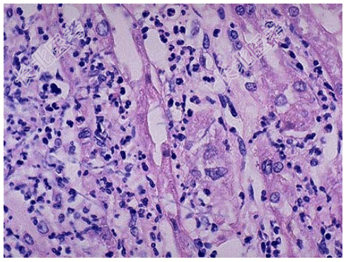 - [材料题] 死者,女性,28岁。因败血症死亡。发病初期曾有持续发热、腰痛、尿频、尿急、脓尿等症状。尸检见双肾肿大,包膜紧张,肾盂肾盏黏膜充血、水肿、表面有脓性分泌物,并可见小脓肿(如图),镜检如图所示。