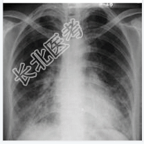 - [材料题] 患者,男性,55岁。咳嗽、发热1周入院。查体:体温,38.1℃;双肺呼吸音粗,双下肺可闻及细湿啰音。心脏听诊无异常。行胸部正位片检查。
