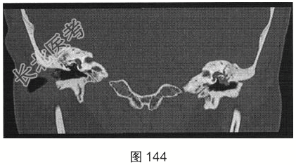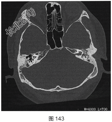 - [材料题] 患者男性,47岁,主诉间断左耳流脓10年,近期耳痛加重,既往无高血压,糖尿病及肿瘤病史。患者既往影像学检查如图143、图144所示。
