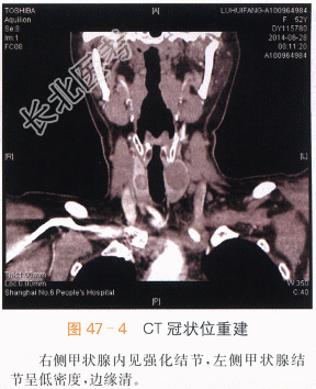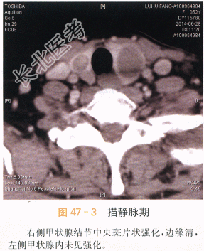 - [材料题] 患者女性,52岁,发现双侧甲状腺结节2年,近期左侧结节增大。体格检查:双侧甲状腺增大,内部扪及多个结节,质韧,活动。实验室和辅助检查TSH5.59IU/ml,T、T正常。超声:双侧甲状腺多个混合性回声结节,形态规则,边缘尚清。左侧结节CDFI未见血流。右侧结节少许血流信号。影像学资料如图所示。