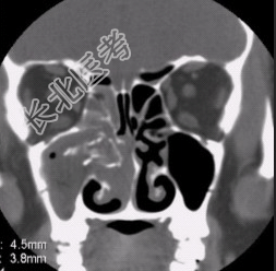 - [材料题] 患者男,35岁,鼻腔分泌物多,流脓涕,鼻塞,头痛,面部局部压痛1个月余。体检:鼻腔分泌物多,鼻黏膜肿胀。CT表现如下图。