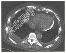 - [材料题] 患者,男,48岁。感呼吸困难、腹胀、乏力、头晕、咳嗽。查体心尖搏动不易触及,心音减低。下肢水肿。行胸部CT扫描如下图: