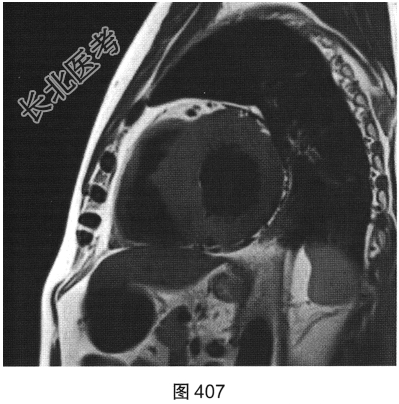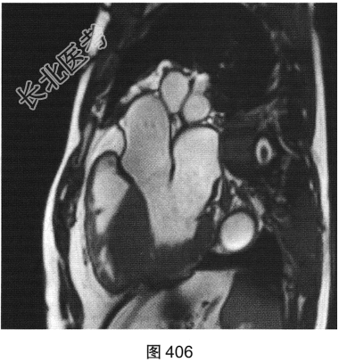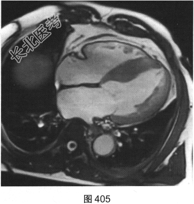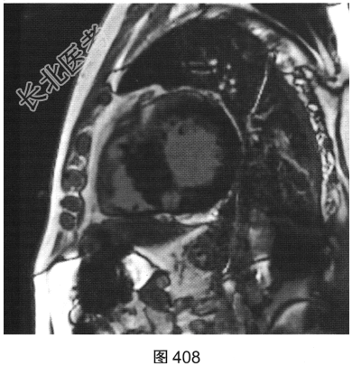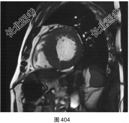- 简答题3、患者超声心动图检查未能明确诊断,临床申请心脏磁共振检查,如图404~图408所示。患者心脏磁共振检查的异常征象有?