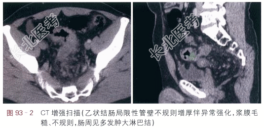 读片分析:钡剂灌肠显示乙状结肠管腔不规则狭窄,肠黏膜破坏;增强CT扫描显示乙状结肠局限性管壁不规则增厚、管腔狭窄,增强后局部肠壁明显强化,浆膜层毛糙、不规则,肠周见多发肿大淋巴结。