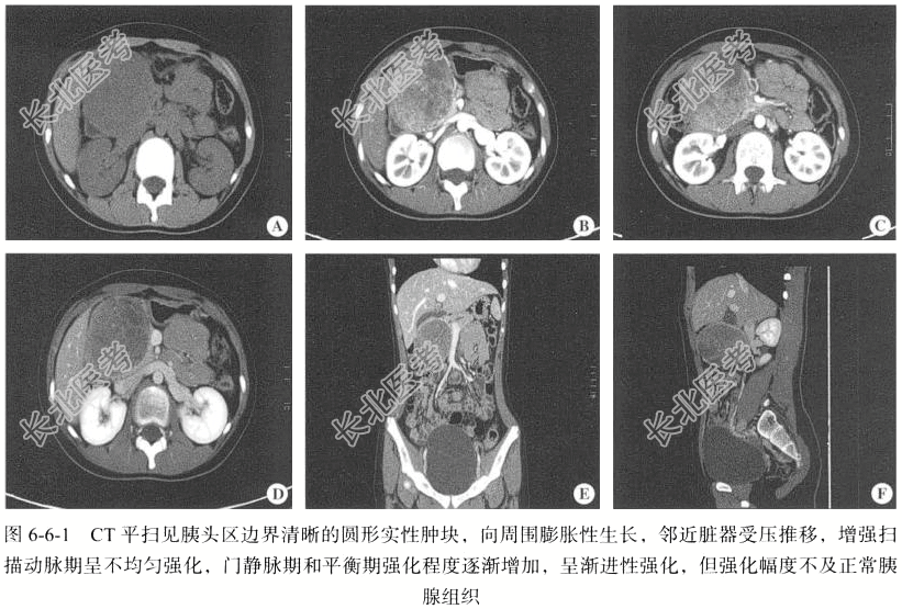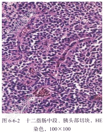 【手术所见】十二指肠中段、胰头部见一类圆形肿瘤,约为8cm×8cm。 【病理所见】结合HE形态学及免疫表型结果,符合胰腺实性假乳头状肿瘤(图6-6-2),肿物大小约为7cm×6cm×4cm,肿物位于十二指肠下方胰腺内,两侧肠切缘未见肿瘤累及,周围淋巴结未见肿瘤转移(0/1)。免疫组化结果:AE1/AE3(-),CD68(少+),CAM5.2(-),CK8(+),CD10(+),Vim(+),β-catenin(+),Syn(-),CgA(-),CD56(+),Ki-67(+8%),S-100(-),SMA(-),CD34(血管+)。