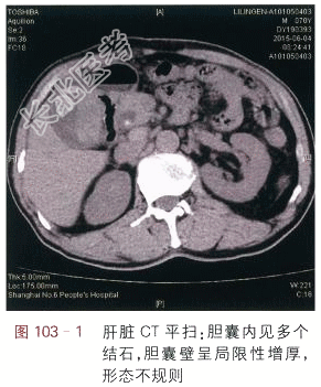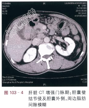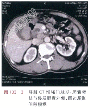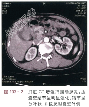 读片分析:肝脏CT平扫:胆囊内见多个结石,胆囊壁内侧呈局限性增厚,形态不规则(见图103-1),肝脏CT增强扫描动脉期:胆囊壁结节呈明显强化,结节呈分叶状,并侵及胆囊壁外侧(见图103-2),门脉期、延时期:胆囊壁结节侵及胆囊外侧,周边脂肪间隙模糊(见图103-3)。