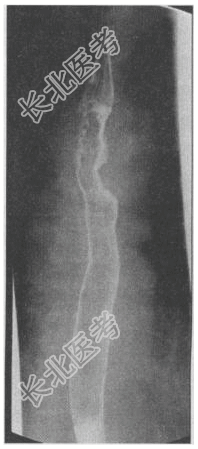 - [材料题] 患者女,63岁。主诉:进行性吞咽困难半年余。上消化道造影如图所示。