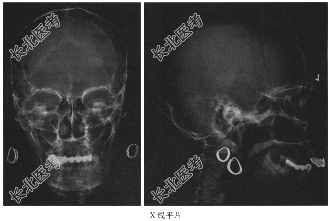 - [材料题] 患者女,76岁,食欲缺乏、乏力伴全身多处疼痛3周入院,无肿瘤病史,行头颅X线平片如图所示。
