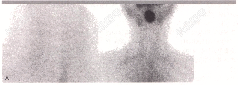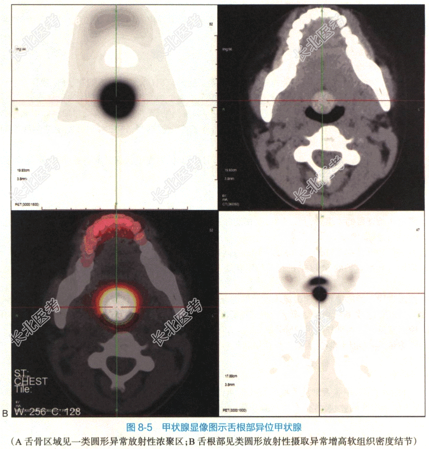 - [材料题] 患者,女,15岁,生长发育迟缓多年。血FT₃、FT₄减低,TSH增高。超声提示甲状腺区未探及甲状腺影像。静脉注射⁹⁹ᵐTcO₄⁻370MBq(10mCi)后20min在甲状腺部位采集前位和抬高位图像。患者取仰卧位,应用针孔准直器的SPECT进行前位甲状腺部位显像,采集预置计数150k。随后行SPECT/CT断层融合显像。 颈部甲状腺床区域未见放射性分布,颌下相当于舌骨区域见一类圆形异常放射性浓聚区(图A)。SPECT/CT断层融合显像示舌根部见类圆形放射性摄取异常增高软组织密度结节(图B)。