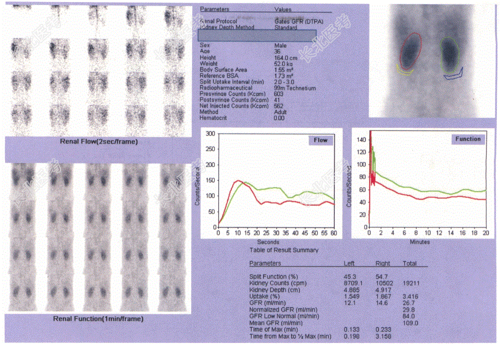 - [材料题] 患者,男,36岁,腹胀伴全身水肿1周,门诊血肌酐1038μmol/L,尿素氮20.89mmol/L。血压140~150/70~90mmHg。泌尿系彩超见双肾皮质回声增强,腹腔积液。SPECT肾显像:双肾显影放射性分布不均匀减低,肾图曲线呈低水平延长线型,双肾GFR明显减低。
