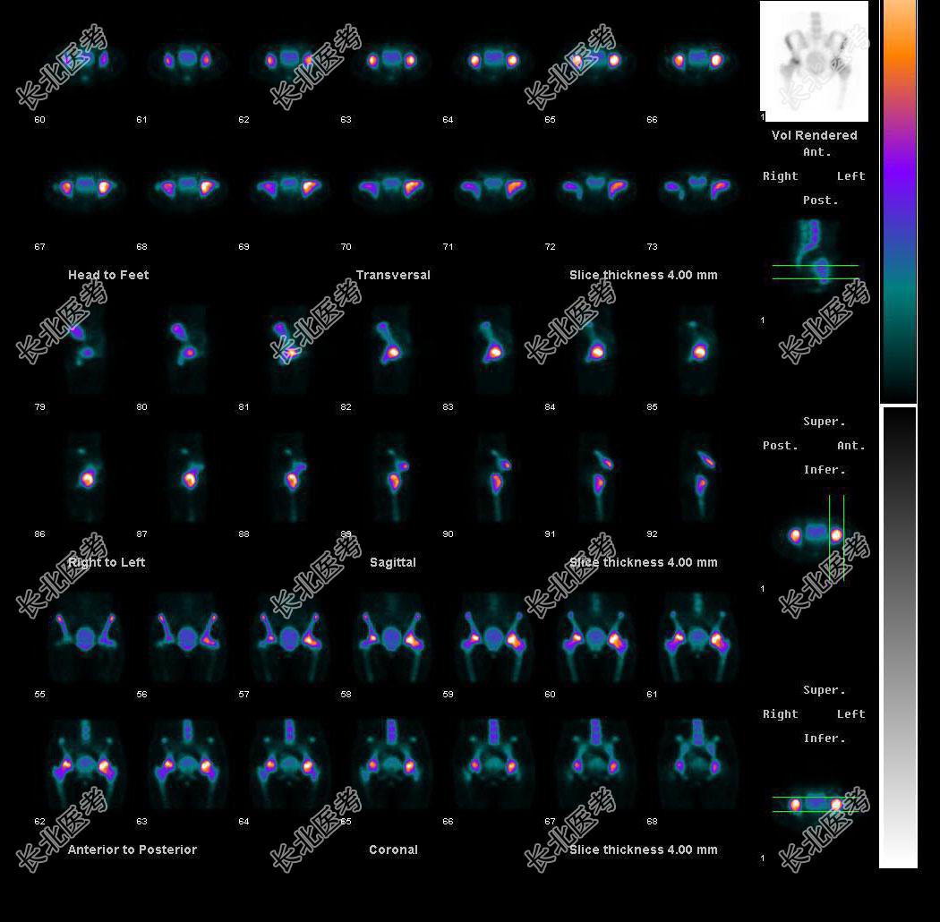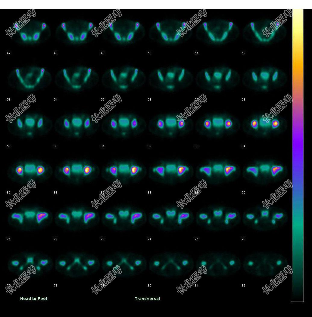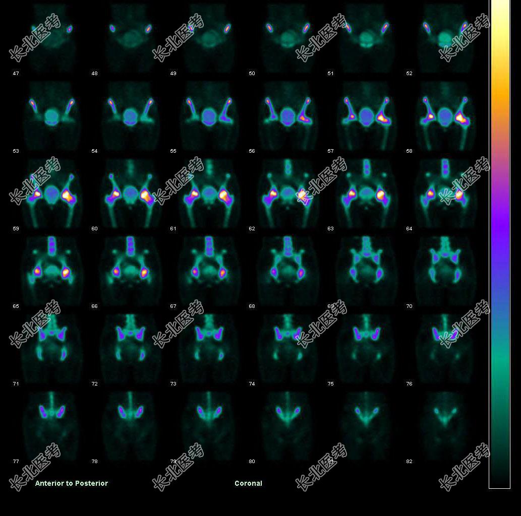 - [材料题] 女性18岁,SLE患者,服用激素类药物治疗1年半,现感左侧髋关节疼痛伴跛行1个月,行全身骨显像及双侧髋关节断层骨显像