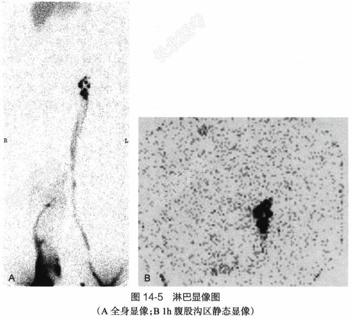 - [材料题] 患者,女,47岁,宫颈癌根治术后2年,术后5个月右下肢出现持续肿胀。查体左下肢未见异常,整个右下肢呈非凹陷性水肿,皮肤增厚、粗糙。彩超提示超双下肢深静脉通畅,为了解肿胀原因行淋巴显像。检查表现:左下肢淋巴链显影正常,全身显像和1h静态显像均可见左侧腹股沟和髂外淋巴结正常显示。在全身显像图上,右下肢深部淋巴链未显影,亦未见右侧腹股沟淋巴结显影;右足和右小腿显影剂淤滞、外溢,可见侧枝淋巴管显影。1h静态显像仍未见右侧腹股沟淋巴结显影(图14-5)。