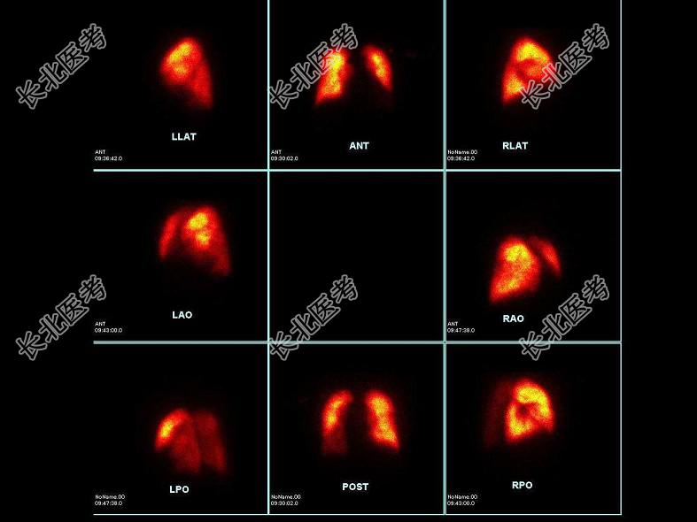 - [材料题] 女,60岁,突发气促、胸痛6小时就诊。胸部X线片示:右侧肋隔角少量积液,上纵隔影增宽,行[~99.gif]Tc[~m.gif]-MAA肺灌注显像如图。