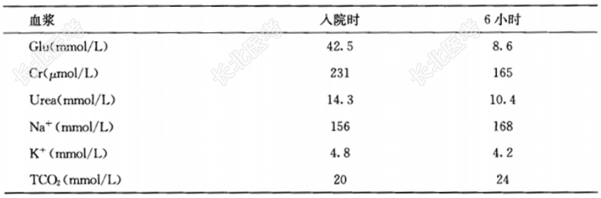 - [材料题] 患者女性,72岁,昏迷状态急诊入院,无法获得病史及既往治疗史。实验室检查:血浆:Glu42.5mmol/L;Cr231μmol/L;Urea14.3mmol/L;Na⁺156mmol/L;K⁺4.8mmol/L;TCO₂20mmol/L;尿常规:葡萄糖(+++);酮体(-)。