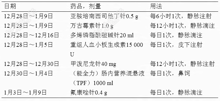 - [材料题] 患者男性,61岁,身高172 cm,体重64 kg。无药物过敏史。查体:体温37.7 ℃,心率122次/分,呼吸23次/分,血压125/77 mmHg(1 mmHg=0.133 kPa)。腹部CT:肝脓肿不排除,胆囊炎、胆结石,脾大,双侧少量胸腔积液。12月28日实验室检查:血白细胞13.8×10⁹/L,中性粒细胞0.76,血红蛋白95 g/L,血小板20×10⁹/L,C反应蛋白>200 mg/L;白蛋白28.4 g/L,丙氨酸氨基转移酶129 U/L,天门冬氨酸氨基转移酶74 U/L,总胆红素38.6 μmol/L,直接胆红素8.86 μmol/L;肌酐79 μmol/L。12月31日引流液培养:肺炎克雷伯菌(不产超广谱β内酰胺酶)。1月2日血培养:人葡萄球菌。诊断:①肝脓肿;②感染性休克;③2型糖尿病。用药医嘱如下表。