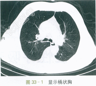 胸部平扫CT:肺气肿,两肺少量慢性为主炎症。如图33-1、图33-2所示。