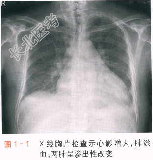 血常规检查:RBC4.22×10¹²/L,PLT215×10⁹/L,WBC6.24×10⁹/L,N70.5%。INR1.77。TB46.9μmol/L,DB26.5μmol/L,A/G35/55(g/L),ALT/AST167/77(IU/L),Na⁺/K⁺/Cl⁻129/4.5/90(mmol/L),BUN21.2mmol/L,Cr/UA169/394(μmol/L),CK/CK-MB52/12(IU/L),TC/TG4.11/1.05(mmol/L),HDL-C/LDL-C0.32/3.31(mmol/L)。心肌肌钙蛋白T(cTnT)0.080ng/ml,氨基末端脑钠肽前体(NT-proBNP)11790.0pg/ml。甲状腺功能正常。X线胸片检查:心影增大、肺淤血、两肺渗出性改变(见图1-1)。超声心动图检查:左心房左心室明显扩大变薄伴整体收缩活动减弱,LVEF33%,二尖瓣中度反流,右心房扩大,中度肺动脉高压。心电图检查:房颤,频发室早,QRS波时限为106ms(见图1-2)。B超检查提示肝淤血肿大,双肾缩小,少量腹腔积液。