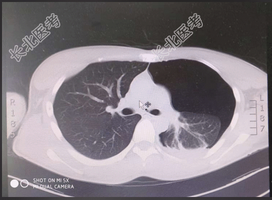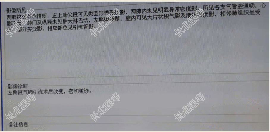 - [材料题] 【一般资料】男性,19岁,学生【主诉】剧烈运动后出现左侧胸痛,伴胸闷1天【现病史】患者1天前,跳远后后出现胸痛,呼吸时明显,休息后无缓解,伴有胸闷,无咳嗽、咳痰,无发热,无放射性疼痛,无咯血、晕厥,2018-10-20门诊行肺CT检查阅片提示:左侧气胸,为求进一步诊治,门诊拟“气胸”收入我科,病程中患者神清,精神可,饮食一般,睡眠一般,大小便正常,体重未测。【既往史】一般健康状况良好;否认高血压病史。否认糖尿病病史。否认冠心病病史。否认慢性支气管炎病史。否认胆结石病史。否认胆囊炎病史。否认“肝炎、伤寒”等传染病病史。未发现药物、食物过敏史。无手术史。否认输血史。【查体】T:36.3℃,P:75次/分,R:20次/分,BP:118/75/mmHg。神清,精神可,步入病房,自动体位,言语清晰,查体合作。皮肤黏膜:无黄染皮疹,无瘀点、瘀斑,无紫绀水肿。浅表淋巴结未触及肿大。头部无畸形,双瞳孔等大等圆3mm,对光反射存在;外耳道无脓性分泌物,听力正常;鼻畅,鼻腔无脓性分泌物;咽无充血,扁桃体不大,伸舌居中。颈软,气管居中,甲状腺不大,颈静脉无怒张,肝颈反流征(-)。左侧胸廓呼吸运动减弱,触觉语颤减弱,叩诊呈鼓音,听诊左侧呼吸音减低,未闻及明显干湿啰音;心率76次/分,律齐,各瓣膜听诊区未闻及明显病理性杂音。腹平软,肝脾肋下未及,无压痛反跳痛,移动性浊音(-),肠鸣音正常。脊柱四肢生理弯曲存在,活动自如,双下肢无水肿。肛门外生殖器:未检。生理反射存在,病理反射未引出。【辅助检查】胸部CT提示:左侧气胸。