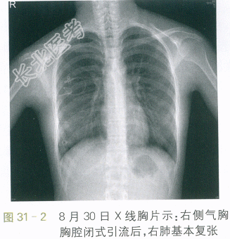2.既往史 无特殊;否认药物过敏史。 3.体格检查 T36.8℃,BP120mmHg/62mmHg,R16次/min,P68次/min,SpO₂99%(不吸氧)。呼吸平稳,口唇无发绀,气管居中。颈部、前胸触诊无“握雪感”。右肺呼吸音低,两肺未及啰音。心律齐,未闻及杂音。下肢无水肿。 4.实验室和影像学检查 血常规、肝肾功能、凝血功能(包括D-二聚体)检查均正常。X线胸片检查示:右侧气胸。胸部CT检查除气胸表现外,未见明显肺大疱。 二、诊治经过 初步诊断:右侧自发性气胸。 诊治经过:入院后予右侧胸腔穿刺抽气,抽气前测胸腔内压力为-3~3cmH₂O,抽气700ml后胸腔内压力为-5~0cmH₂O,观察3min后压力变化为-3~3cmH₂O,考虑为交通性气胸,行右侧胸腔置管闭式引流,2014年8月29日随访X线胸片提示气胸基本吸收,夹管24h后复查X线胸片未见反复(见图31-2),予拔管后出院。期间给予吸氧治疗。